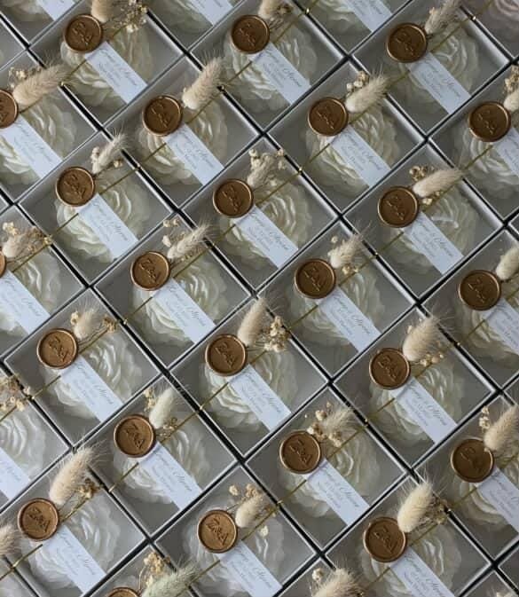 Each candle favor is thoughtfully curated to arrive fully assembled and ready to gift. The elegant Peony-shaped scented soy wax candle is carefully placed inside a clear premium gift box, then finished with a gold wax seal embellishment, a delicate gold string wrap, and a mini dried flower bouquet. A personalized name and date tag completes the design, turning every piece into a refined keepsake your guests will truly appreciate—no extra preparation required.