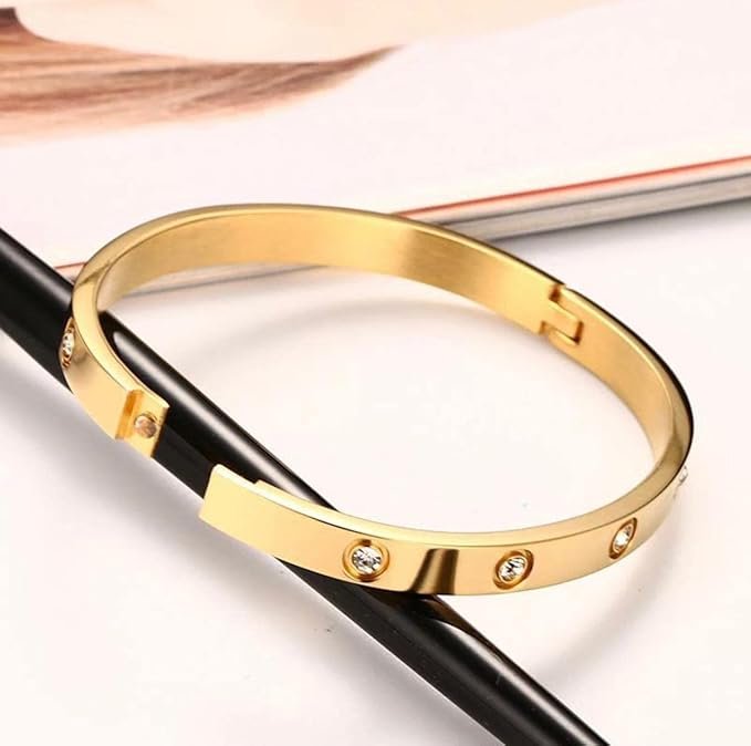 Add a touch of timeless elegance to your style with our Gold Plated Stainless Steel Openable Crystal Bracelet for girls and women. Designed with precision, this bracelet features a sleek openable design that makes it easy to wear and remove while ensuring a secure fit for all-day comfort.